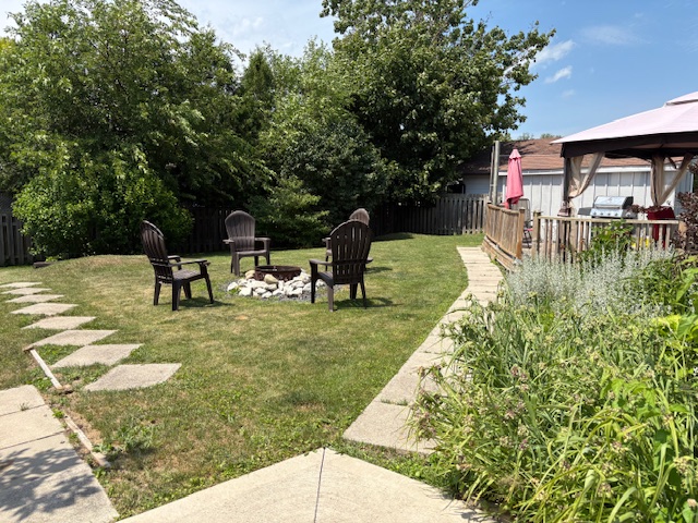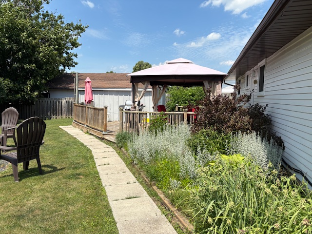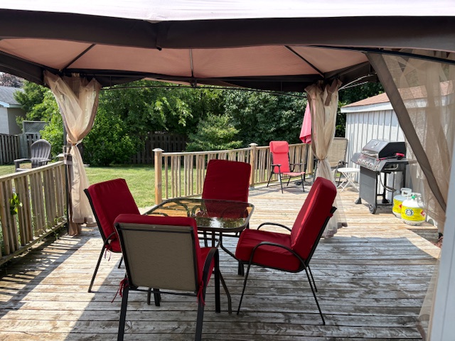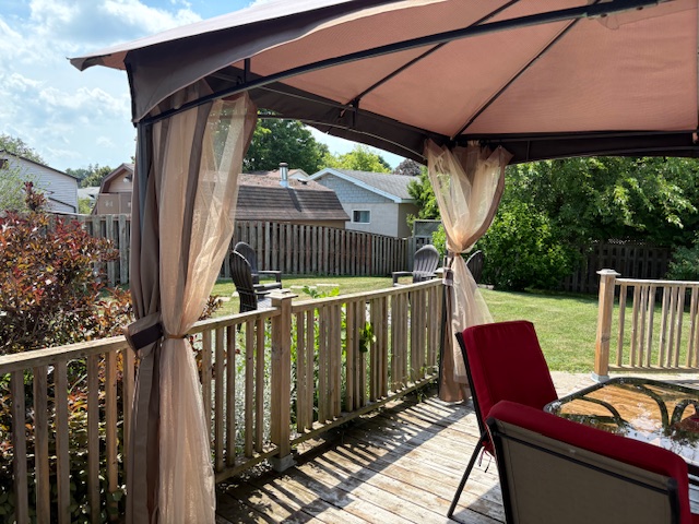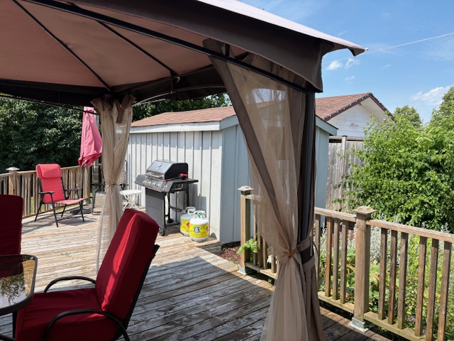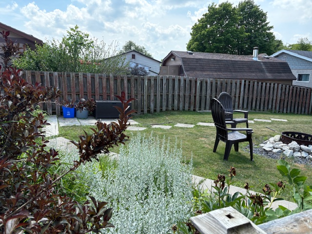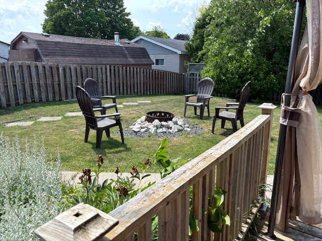 A large, fenced in, private backyard with firepit, deck, patio, patio set and plenty of room to play your family’s favourite outdoor games. Back deck has a propane BBQ for your vacation meals.