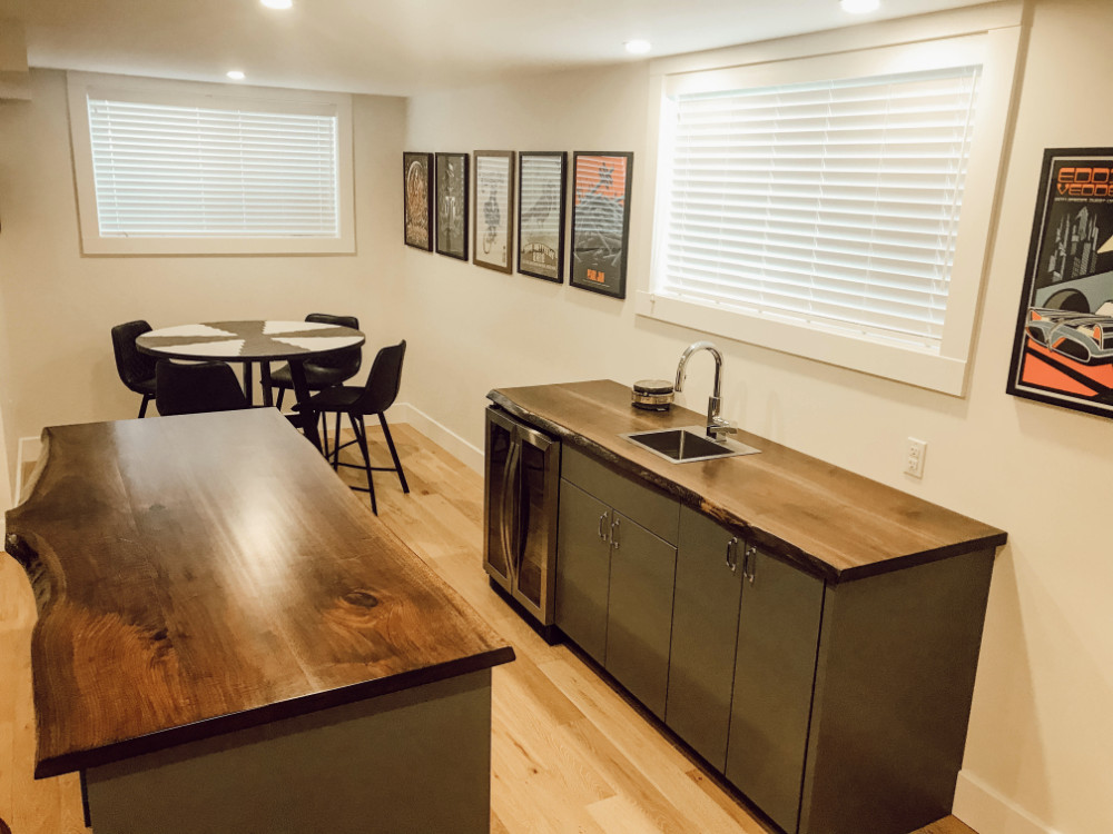 Lane's End Southampton also features a media room with card table, bar with sink and built in fridge. The 65 inch smart TV! The main floor features an open concept living space with oversized breakfast bar, dining table and relaxing sitting area with gas fireplace. The outdoor space includes a Scandinavian style fire pit and warm water outdoor shower for rinsing off after the beach! The picnic table is a great spot for outdoor dining and the covered porch is the perfect place to relax at the end of the day! The lovely kitchen is a chefs dream including a KitchenAid gas range, dishwasher and fridge with filtered water and ice maker. Our kitchen includes everything you would need to prepare a family meal. If you don’t feel like cooking on holiday there are many wonderful restaurants a short walk away!